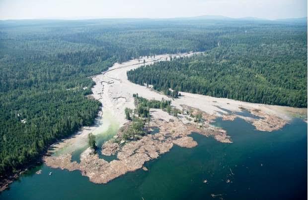 Contents from the Mount Polley tailings pond are pictured going down previously tiny Hazeltine Creek into Quesnel Lake near the town of Likely on Aug., 5, 2014.