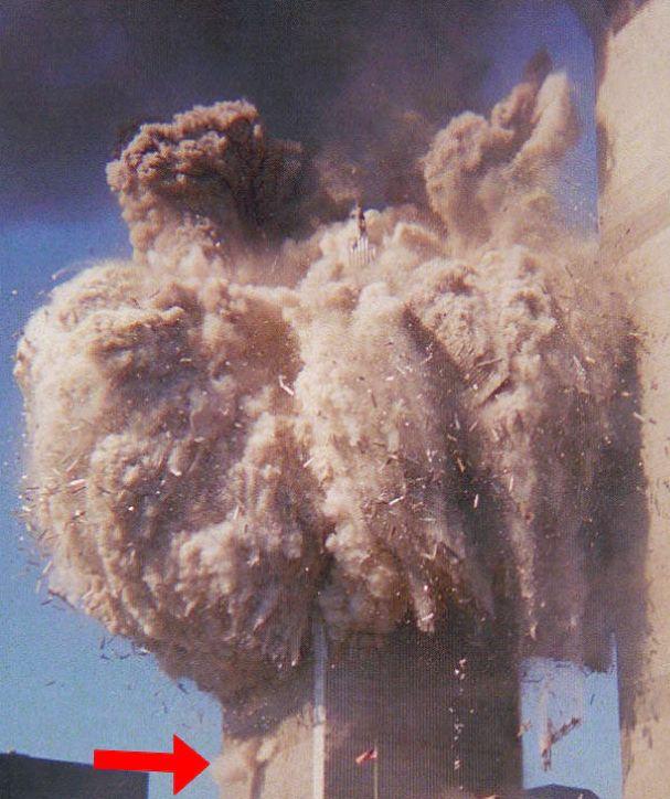 The arrow in the above photo points to an explosive “squib” that proves that there were pre-planted explosive devices that severed, on every floor, the massive internal steel beams and girders so that the doomed building will collapse (or dissolve) entirely into its own footprint in a matter of seconds, thereby minimizing the damage to adjacent buildings (the goal of all controlled demolitions). Note that chunks of the steel beams have been explosively thrown upwards and outwards at high speeds due to the power of the demolition charges that had been planted by unknown co-conspirators in the three buildings over the weeks prior to 9/11/01. All the concrete in WTC Towers 1 & 2 was pulverized into fine dust, and over 600 small chunks of human bone fragments were found on the top of the adjacent Deutsche Bank building two years later.