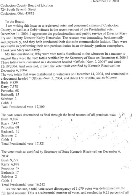 On December 14 as the recount began, the BOE distributed a document entitled "Official - Nov. 2, 2004" dated December 10, 2004, including lists of vote totals, indicating that the Board had secretly hand recounted the ballots prior to the official recount. Fry, in her December 27 letter to Kettler, admits to the secret recount: "DURING THE TIME OF HAND POSTING ELECTION CERTIFIED RESULTS ON OUR ABSTRACT MANY OF THE FIGURES WERE UNUSUAL LOOKING. THEREFORE KATHY [HENDRICKS] AND MYSELF PULLED SEVERAL PRECINCTS AND HAND COUNTED THE PRSSIDENTAL [sic] RACE ONLY, FINDING MANY ERRORS IN TOTALS THAT WERE CERTIFIED TO THE SECRETARY OF STATE's OFFICE."