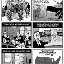 Kirk's controversial cartoons have been publicly denounced by a governor, officially condemned by a state university, personally admonished by a U.S. senator, reviled in print by an archbishop, and vilified by police, business leaders, talk radio, the NRA and others. (He does manage to get along with his neighbors.)