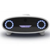 Black faced white bordered device like a radio with two round knobs facing out that look like eyes and lines in the middle that look like a mouth