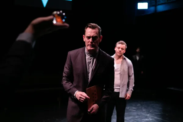 For the first time this longtime reviewer of shows at The Gang’s Ivy Substation saw seats for ticket buyers on the performance area. The play’s mise-en-scène takes place on a barebones set (designed by Mit Snibbor) with a huge telescreen mounted on the wall wherein live overhead images of the action and what appears to be some original footage in a newsy format are simultaneously seen (projection design by Cihan Sahin). This references Orwell’s startling idea that viewers can be surveilled through TV screens: “Big Brother is watching you.” Sullivan’s script only mentions this techno-innovation in passing but for viewers unfamiliar with Orwell’s work this stunning concept should be emphasized. (Whistleblower Edward Snowden, whose memoir Permanent Record coincidentally recently dropped, claims that nowadays spies can observe users via their computer screens.)