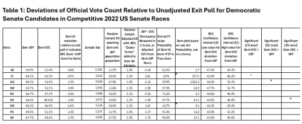 Table 1 below shows how likely the Official Vote Count (OVC) is, given the UEP, for Democratic Senate candidates in competitive 2022 US Senate races for which exit polling was conducted.