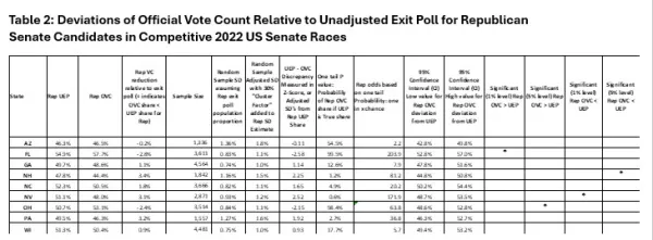 Table 2 below shows how likely the Official Vote Count (OVC) is, given the UEP, for Republican Senate candidates in competitive 2022 US Senate races for which exit polling was conducted.