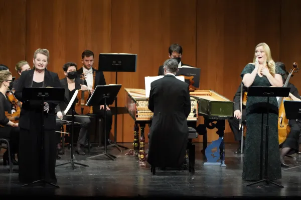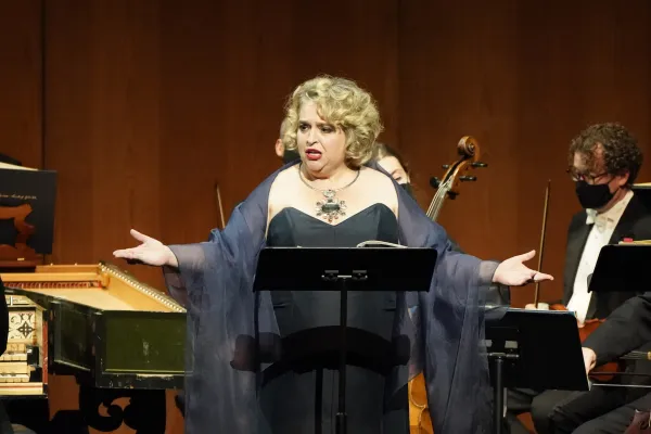 In their LA Opera debut The English Concert performed the three-act, three-and-a-half-hour production in, more or less, modern dress and sans the elaborate sets and props that often regale the Dorothy Chandler Pavilion’s sumptuous stage. The 20-plus musicians of The English Concert, presided over by Liverpudlian Harry Bicket – who also displayed virtuoso finger work on a period harpsichord – did not play in the pit, where James Conlon usually conducts the LA Opera Orchestra. Rather, The English Concert performed onstage, where they were periodically joined by Alcina’s six singers, standing behind music stands holding the opera’s score and lyrical libretto. (Thomas Foster is also listed in LA Opera’s credits under harpsichord.)