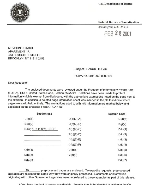 A month after the Marin attack, Dan Quayle made a televised speech denouncing Tupac’s first album and blaming it for a police officer’s death in Texas (which Tupac then sampled for a song on his second CD). Not mentioned was much evidence that San Francisco Bay area FBI director Richard Held had orchestrated these attacks on Tupac. A reporter in All Eyez states that “there is rumor that the FBI has a 4,000 page file on you.” This isn’t just a rumor as this movie review writer filed a Freedom Of Information Act (FOIA) request and a FOIA worker said there was over 4,000 pages. Only 99 were sent and even they were heavily redacted.