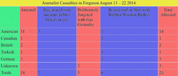 The world turned its eye to Ferguson Missouri in August after police shot an unarmed black teenager in front of witnesses. The protests that followed were met with a militarized response, including Pentagon surplus mine-resistant vehicles topped with snipers, tear-gas, assault rifles and policemen in camouflage body armor. There were conflicting claims of force being used by the protestors which proved difficult to verify. During the nine days of turmoil 24 journalists became casualties.