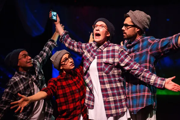 Lynde Houck is scene stealing as the daughter Aphrodite and Dionysus are ashamed of. As Poinsettia, Houck has a recurring role throughout the mirthful menagerie onstage. Why are the pagan Greeks “ashamed” of their misbegotten daughter? Because their woebegone offspring, alas, is a Christian and, as her flowery moniker suggests, Poinsettia is filled with unabashed Christmas spirit. This includes a rousing rendition of The Ronettes’ classic rock Christmas song, “Sleigh Ride,” which The Gang-sters gaily rock out to in an outburst of pure unadulterated joy.