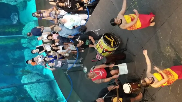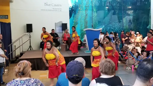 Many of the performances took place in the Aquarium’s Honda Blue Cavern - a gigantic glass encased watery habitat full of sea life such as moray eels, leopard sharks and giant sea bass, providing a perfect backdrop for the Oceanic entertainers (who are mostly SoCal-based individuals of Pacific Islander origins). Some performances took place on the Aquarium’s outdoor grounds in the Marine Theater, where the Kiribati Dancers held forth. (Kiribati is an independent nation in Micronesia, formerly known as the Gilbert Islands.)