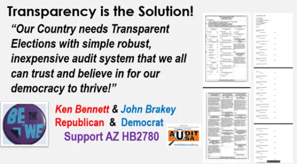 HB2780 will help to create elections that are transparent, trackable, and publicly verified, which should be everyone’s goal regardless of political affiliation. Please feel free to contact me, John Brakey, or any of the people listed below if you have questions about this bill. Ken Bennett and I, together or separately, will make ourselves available to meet with you. I will be at the Senate Lobby no later than 10 AM Tuesday. My cell phone number is (520) 339-2696.