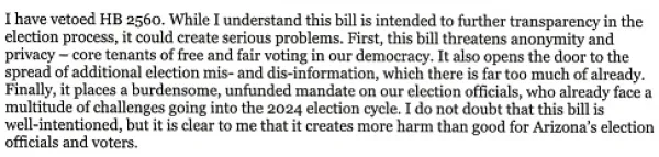In her veto statement, Gov. Hobbs incorrectly claimed that publishing ballot images would threaten anonymity and privacy and add to the spread of mis- and dis-information.