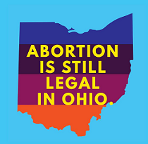Map of Ohio in the background with colorful stripes and words Abortion is still legal in Ohio