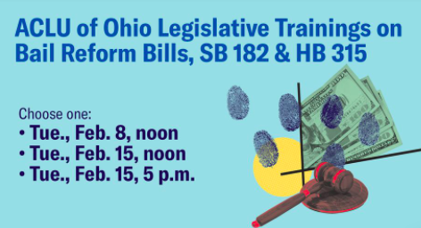 Join the ACLU of Ohio for an overview on bipartisan bail reform bills Senate Bill 182 and House Bill 315, practice role-play scenarios for conversations with legislators, and connect with pretrial justice advocates in your region