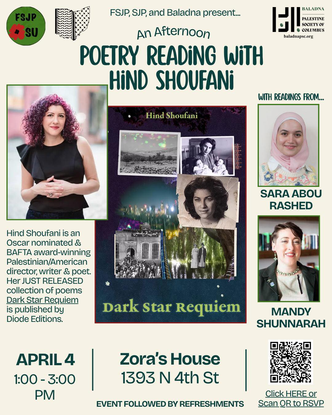 Baladna: Palestine Society of Columbus held an afternoon poetry reading featuring author and filmmaker Hind Shoufani, with readings by Mandy Shunnarah and Sara Abu Rashed.