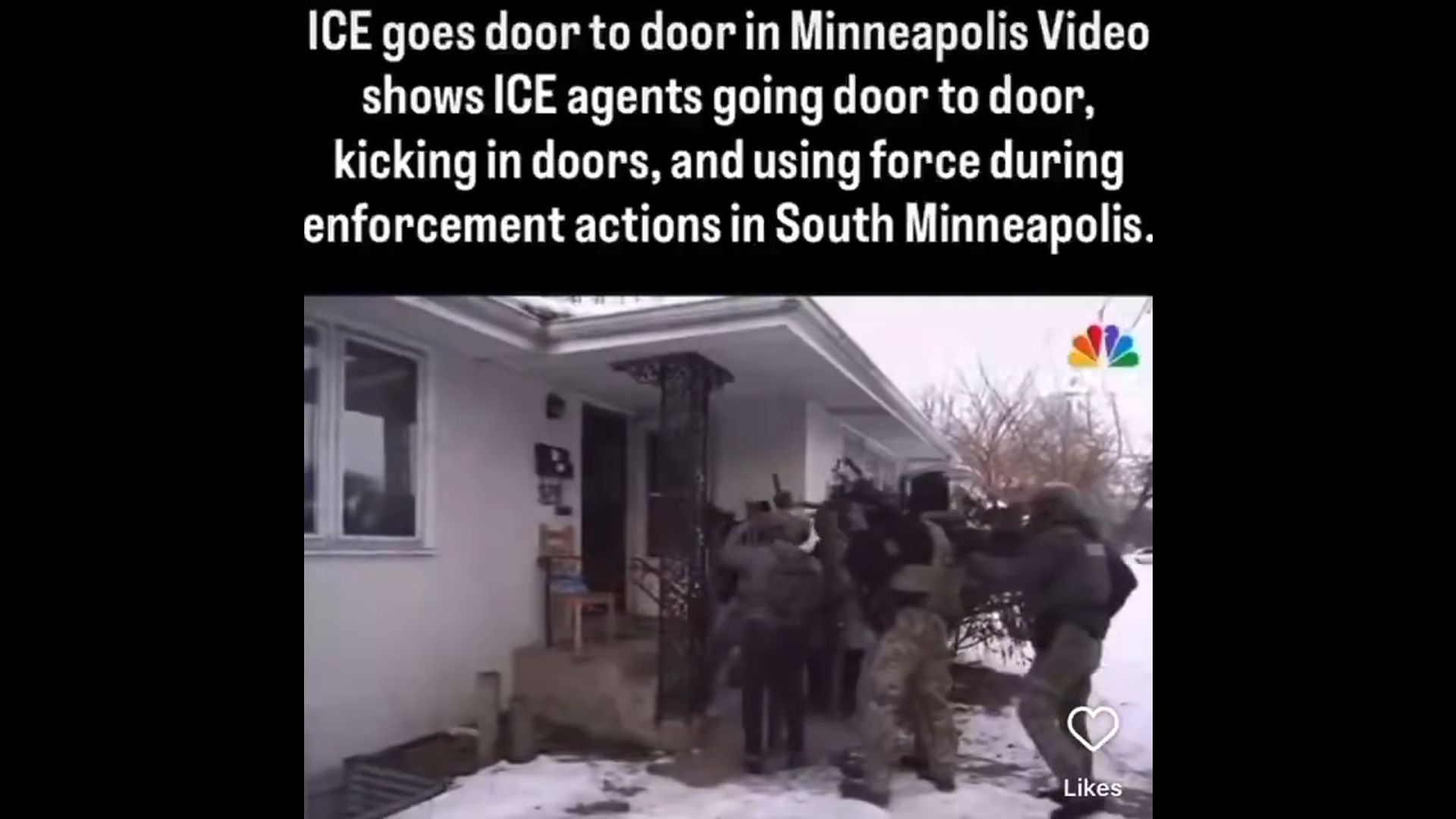 According to footage from CNBC, it is no longer just a proposition out of the mouth of JD Vance. ICE agents are going door to door, kicking in doors, and breaking into peoples homes in Minneapolis. This is a direct violation of the U.S. constitution and something needs to happen about this NOW. If you are seeing this, call ALL of your congressperson now even if you don’t think it’ll do anything. And if you are nearby, help the community who is standing up against this BLATANT fascism.