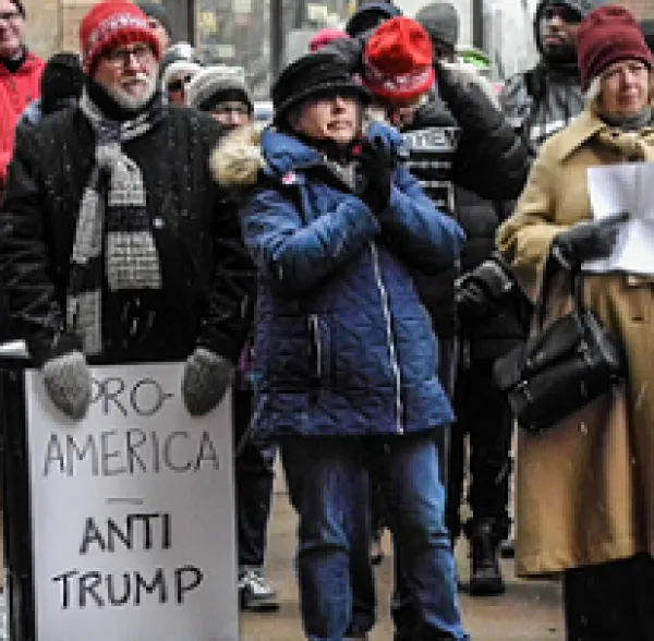 Woman in cold weather gear holding a sign at a protest outside that reads The Trump Presidency is the REAL emergency