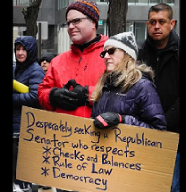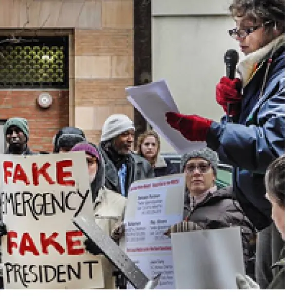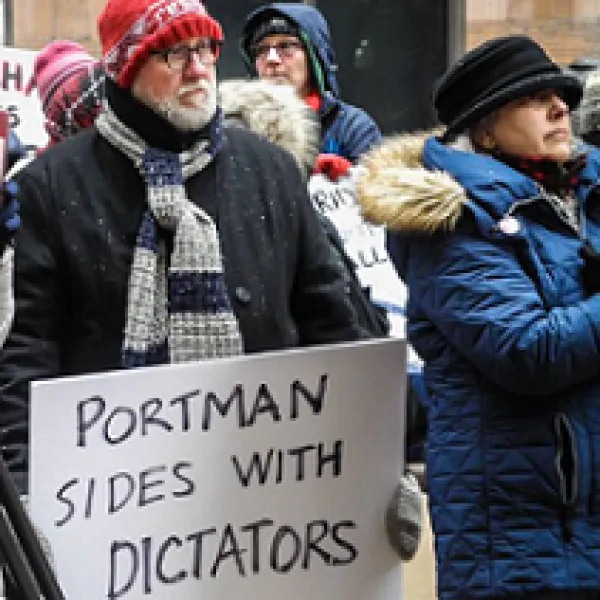Over 100 people gathered on a cold Monday morning February 18th -- President's Day -- in downtown Columbus to protest what they called Trump's fake emergency on the border to justify his spending more money to build a wall. They marched to U.S. Senator Rob Portman's office to appeal to him to stop the fake emergency to stop the wall.
