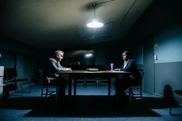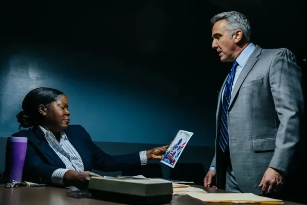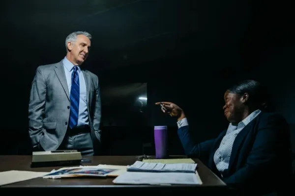 After passing through the ersatz (or was it?) tachometer about 30 audience members climbed up a flight of stairs to the inaugural performance to be held in the Henry Murray Stage and sat around a space about as big as a medium sized room. In the middle was a table with files and an old-fashioned cassette tape recorder atop and a light above it, plus two chairs, from which Caucasian officer Boyd Sully (John Colella) and African American LaRhonda Parker (Julanne Chidi Hill) face off against one another in an inquiry about a traffic incident with a young Black man that went very, very wrong.