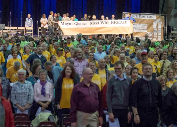 BREAD members view social justice as God’s work. Being ignored doesn’t discourage them. At the end of the assembly they unfurled a large banner that read “Mayor Ginther Meet with BREAD!” and posed with it in a gigantic group photo. Most of the people present also signed paper petitions with the same demand.