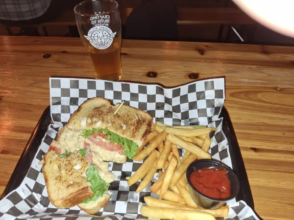 I received my No Tuna sandwich and fries. The No Tuna tasted delicious, the bread browned on both sides by exposure to radiant heat. The No Tuna held a consistency which didn’t imitate stale fish. Plant-based No Tuna is Purity instead of pungent. No tuna enjoyed a delectable noshing. The fries were crisp, and scrumptious. I declared Meatless Mondays at Yellow Springs Columbus as a new bliss.