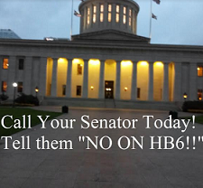 Photo of Ohio Statehouse - big white government building with columns and round rotunda at top and words Call your senator today - tell them NO ON HB6