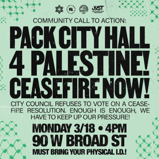 Monday, March 18, 2024, 4:00 PM. Pack City Hall 4 Palestine! Ceasefire Now! Columbus City council refuses to vote on a ceasefire resolution. Keep up the pressure. Location: 90 W. Broad St., Columbus. Bring your photo ID.