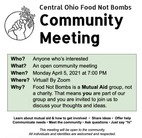 Central Ohio Food Not Bombs is holding a general community meeting! Food Not Bombs is a mutual aid group, not a charity. That means that you are part of our group and you are invited to join us to discuss your thoughts and ideas.