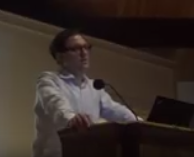 White man with glasses and white shirt standing and speaking at podium