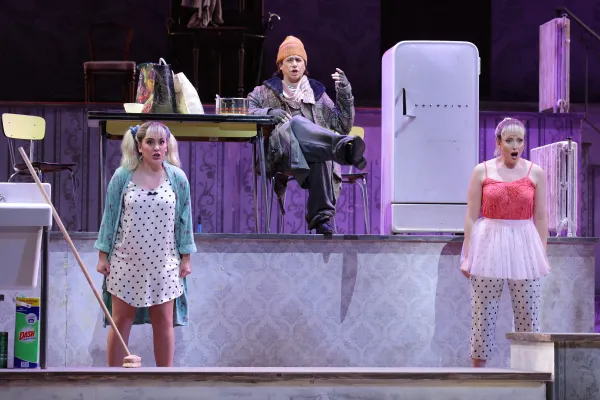 Cinderella (Neapolitan mezzo-soprano Serena Malfi makes her splendid debut at LA Opera) plays the exploited housemaid who works her proverbial fingers to the bone trying to clean Don Magnifco’s (Italian baritone Alessandro Corbelli, who first played this role at the Dorothy Chandler in 2013) ramshackle household, which has seen better days. The down-on-his-luck Don and Cinderella’s haughty stepsisters, Tisbe (Mexican mezzo-soprano Gabriela Flores) and Clorinda (Rhode Islander soprano Erica Petrocelli) mercilessly oppress their hardworking part-sibling, who is reminiscent of Carol Burnett’s iconic charwoman.