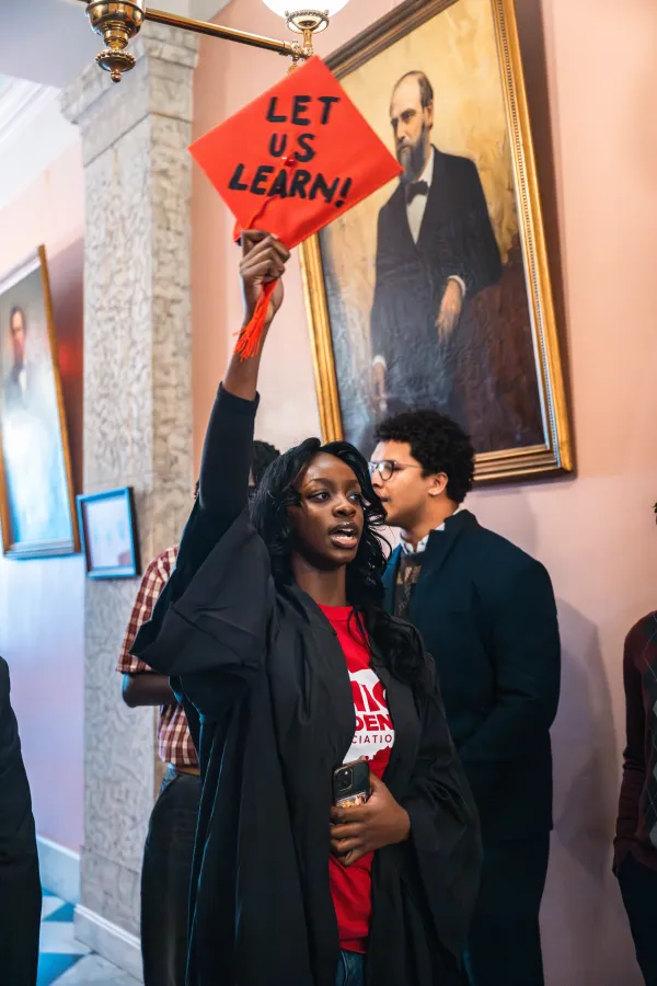 Students gathered in the atrium holding signs and graduation caps reading “Listen to Students” and “R.I.P. my degree” before marching to the hallway outside the Harding Press Room. Students chanted as incoming Chair of the Senate Higher Education Committee, Kristina Roegner, took the stage, her speech overshadowed by the booming chanting of college students: “Higher ed will be dead”.