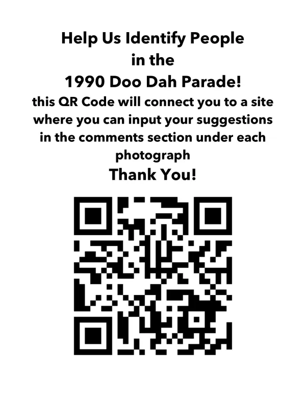 In addition to the in-person exhibit of photographs at the Short North Tavern, this project includes a concerted virtual effort to identify individuals in the 1990 images. The grassroots organizers were affiliated with BalletMet, Columbus Museum of Art, Wexner Center for the Arts, Players Theatre, Citizens for a Better Skyline, Used Kids Records, Columbus Alive, Heritage Village, Ohio Arts Council, Greater Columbus Arts Council, Team Volatile, Stuart Pimsler Dance Theater Company, Dialogue Magazine, and The Ohio State University Art Department, including students. Long-time fans of Doo-Dah and employees/members/board members from these organizations are invited to visit @auguryart on Instagram to assist in identifying individuals in each photograph. This QR Code can also be used: