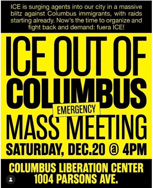 Olivia Rowland, an organizer with ICE Out of Cbus, said: “It’s clear that these ICE attacks, which follow President Donald Trump’s despicable comments regarding our Somali neighbors, are meant to cause fear and terror. The ruling class wants to divide us to distract us from the real issues facing all workers. This mass meeting will show that we are united, and we will fight back. We won’t stop until ICE is out of Columbus!”