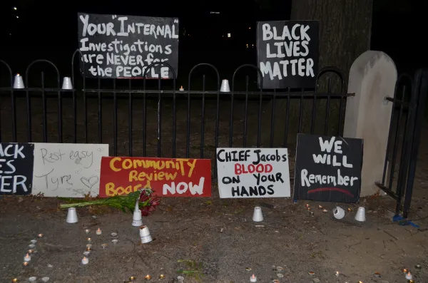 Candles and a sign that says "Mayor Ginther Blood on your hands"