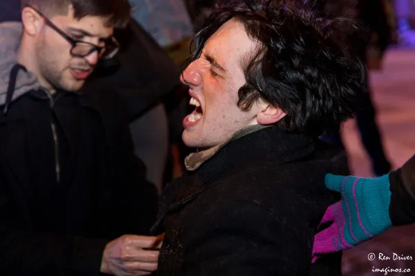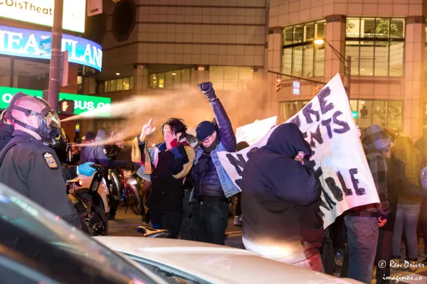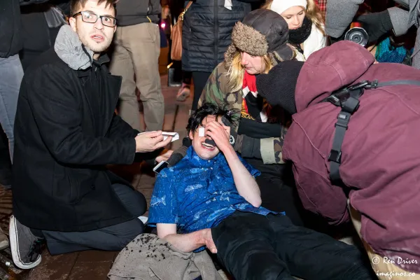 Volunteer medics were also on the scene to support the protesters, administering Maalox to flush their eyes. A police cruiser deliberately bumped into one of the medics, Atticus Garden, who was then arrested.