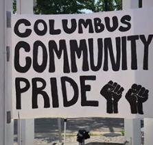 Big white outdoor sign saying Columbus Community Pride with two fist drawings