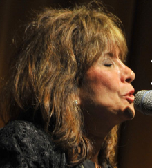 Sally Fingerett singing at a mic