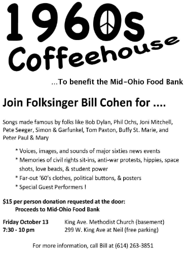 Bill Cohen and friends will lead a candlelit, musical, year-by-year journey through the era, with live and familiar 1960’s folksongs, “news reports” of sixties happenings, displays of anti-war buttons and posters, and far-out sixties fashions.