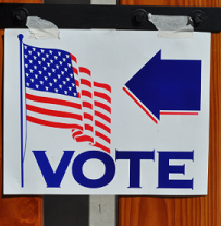 A white sign on a wood wall with a flag and an arrow pointing left and the word VOTE