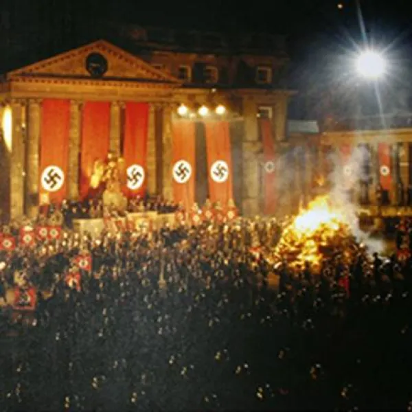 Right-wing Germans preparing for the book-burning of 5/10/33        Crowd of flag-waving German fascists at the book-burning of May 10, 1933