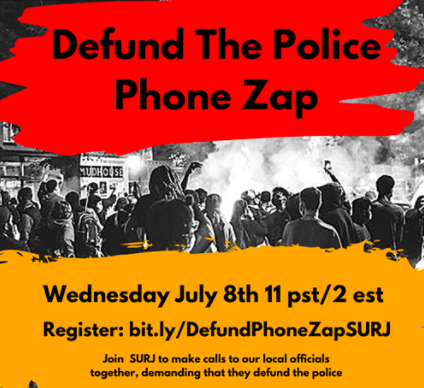 Join us today! This is the second Defund the Police Phone Zap and we will be continuing them the next two weeks at the same time. Register for today's session Wednesday July 8th at 2 ET / 11 PT. bit.ly/DefundPhoneZapSURJ