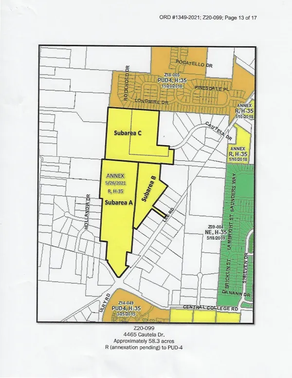On July 26, 2021, Columbus City Council heard Ordinance 0349-2021 To rezone 4465 CAUTELA DR. (43081), being 58.3± acres located west of the terminus of Cautela Drive and at the northwest corner of Central College Road and Lee Road, From: R, Rural District, To: PUD-4, Planned Unit Development District (Rezoning #Z20-099).
