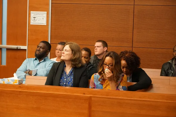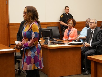 Diona Clark, front left, tells the court she would like Larry Belcher, who shot her twice, to serve prison time, as Belcher sits behind her with his attorney Jim Owen, right.
