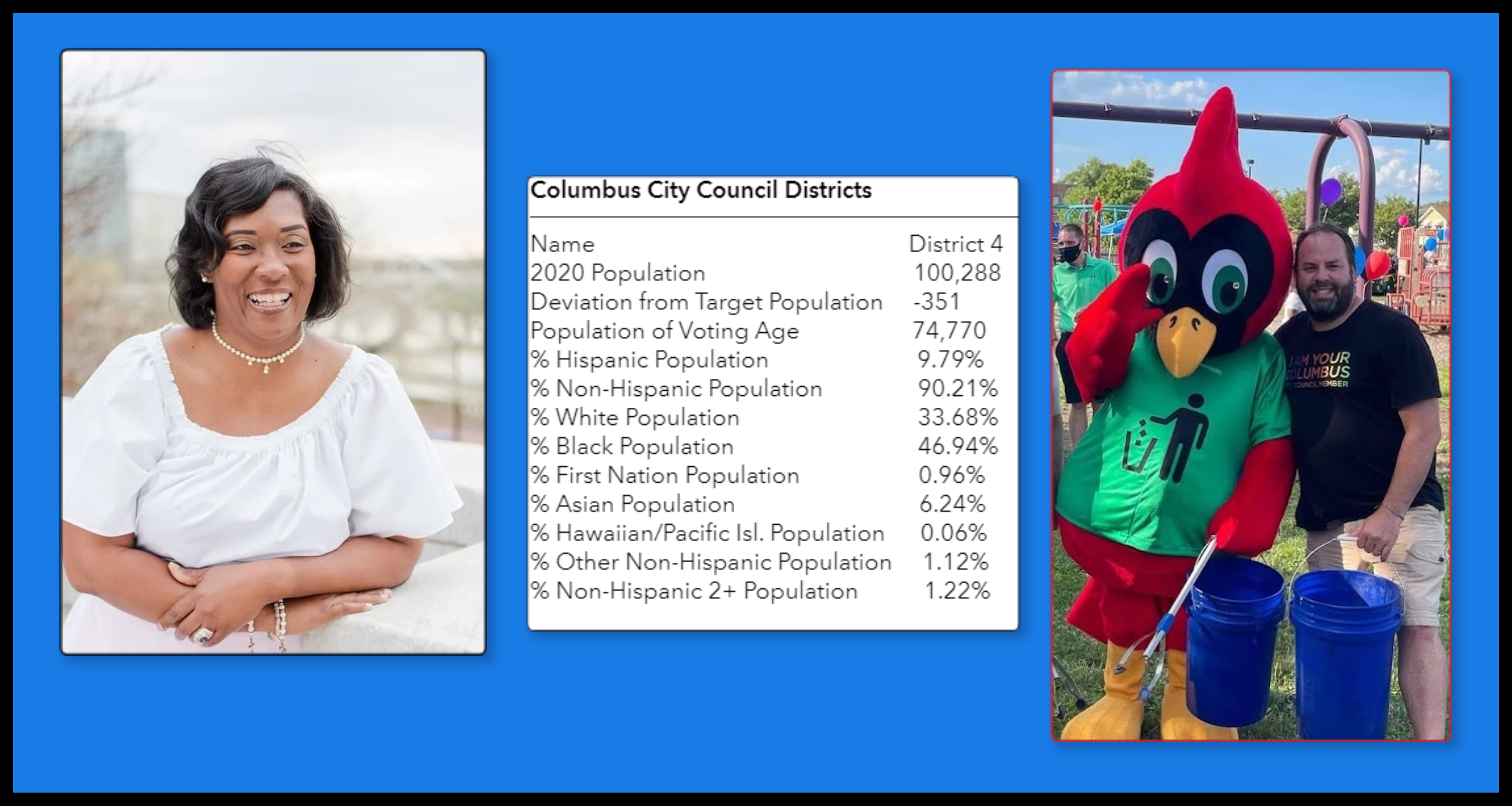 In District 4 (pictured above) the Black population is 46 percent compared to 33 percent white. Hood, a retired air force Master Sergeant, is “most passionate about public safety, mental healthcare, affordable housing, and public education,” states her campaign website. Remy, as Chair of the Environment Committee, created the Cleaner Columbus Initiative in 2019, to combat litter with help from Scarlet the Litter Cardinal.