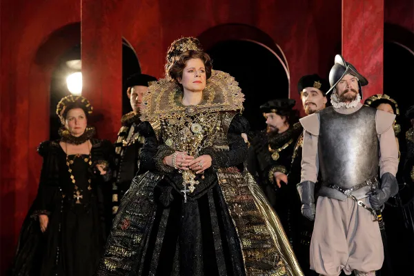 Of course, conquest, colonialism and occupation often require brutal militarism, and Philip’s own son, the titular Don Carlo (Mexican Ramon Vargas) beseeches his father to end the vicious suppression of Spanish forces at Flanders (no, not Homer Simpson’s animated neighbor Ned, but the Dutch-speaking northern portion of Belgium). The Spanish Crown Prince’s anti-cruelty quest is backed by his true blue pal Rodrigo, Marquis of Posa (legendary Plácido Domingo, singing here as a baritone), and the “two amigos” sing a stellar duet affirming the bonds of their friendship.