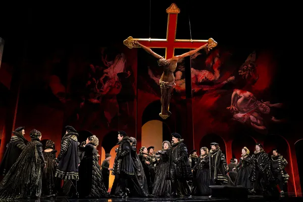 Towards the end of Act II and before the curtain dropped for intermission, an auto-da-fé - with brilliant mise-en-scène of a mass spectacle, including a gigantic crucifix with a wooden Christ affixed to it - is expertly staged by director Louisa Muller. These public punishments lynched so-called “heretics” and “apostates” during the despicable Spanish Inquisition, often with execution by immolation - burnings at the stake - and drowning (extreme water boarding). (Interestingly, in 2017 LA opera presented another auto-da-fé in its production of Leonard Bernstein/Lillian Hellman’s Candide, based on Voltaire’s Enlightenment era novella.)