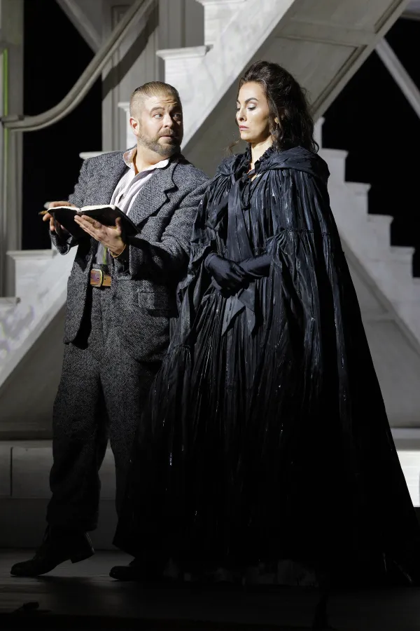Danish choreographer Signe Fabricius and English associate Anna-Marie Sullivan provide the steps for a dance that Don Giovanni throws at his villa. Andrew Kenneth Moss is the fight director, and Sara E. Widzer is the bawdy opera’s intimacy director (leave the kiddies at home for this “PG-rated” production about a smarmy if charming rake). Although I’m no expert on mid-17th century Spanish fashions, some of Danish costume Designer Anja Vang Kragh’s apparel seemed to my untutored eye to be period pieces, while other garb, such as Don Ottavio’s tuxedo, looked quite contemporary.
