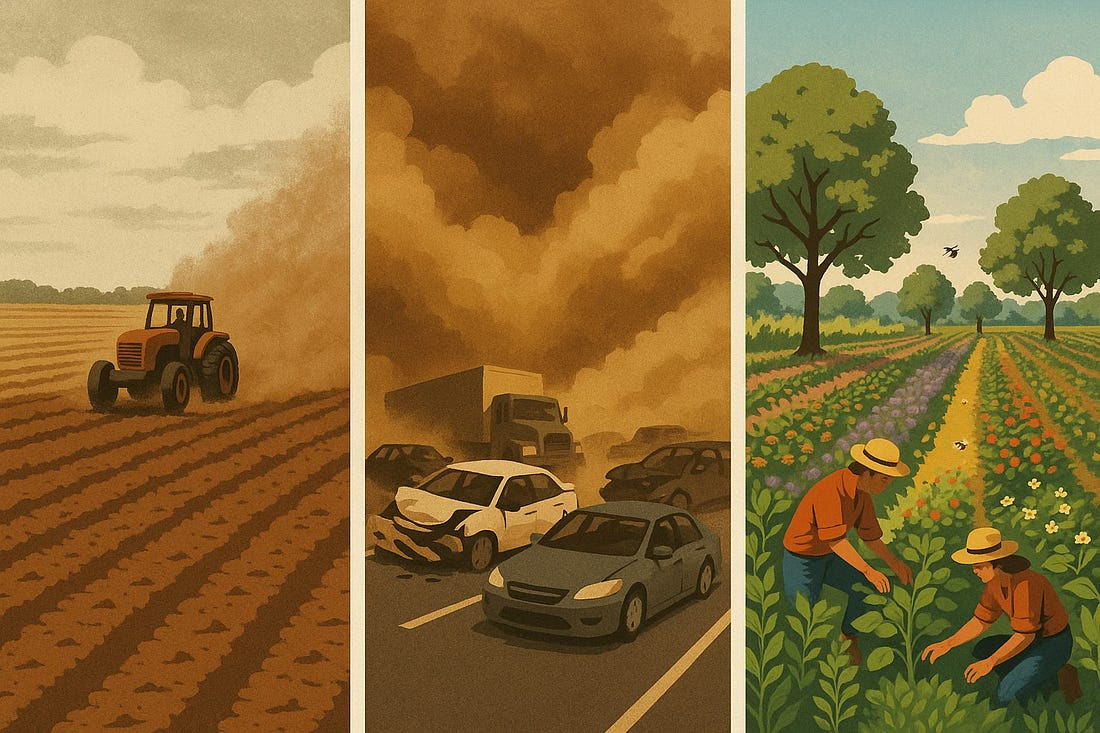 In the spring of 2025, central Illinois was swallowed by a wall of dust so dense it erased the horizon—and lives along with it. Vehicles collided in a deadly chain reaction on Interstate 55, as visibility vanished and the dust became a visible cry from the land, a desperate signal of the devastation being wrought upon it. This was not a natural disaster. It was the consequence of decades of extractive farming practices that leave the land bare, lifeless, and vulnerable. It was a warning that when we abuse the soil, we unravel the systems that protect our safety, our health, and our future.