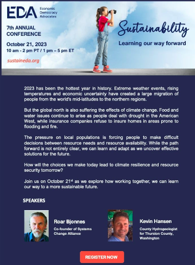Speakers: Roar BjonnesCo-founder of Systems Change Alliance, Kevin HansenCounty Hydrogeologist for Thurston County, Washington