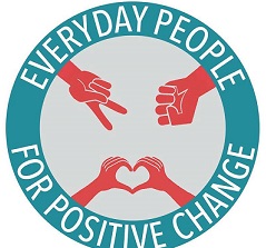 Round blue circle with words everyday people for positive change going around inside a ring in white letters, inside the circle a red hand doing a peace sign, a red hand making and fist and two red hands creating a heart with their fingers together