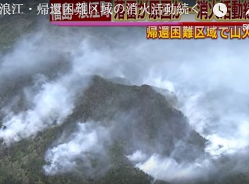 The fire, which began on April 21 in the mountains outside Namie in Fukushima Prefecture, Japan, is in an area where human entry is barred “on principle” because of high radiation levels resulting from the Fukushima nuclear triple meltdowns and explosions. The fire is being fought from the air with helicopters spraying water.